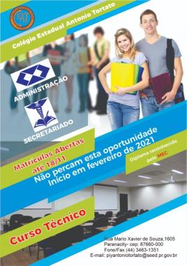 16:00 Matrículas Cursos técnicos Estão abertas as matrículas para os cursos técnicos no Colégio Estadual Antonio Tortato-Paranacity Lembrando que o período de matrícula irá até o dia 18/11/2020